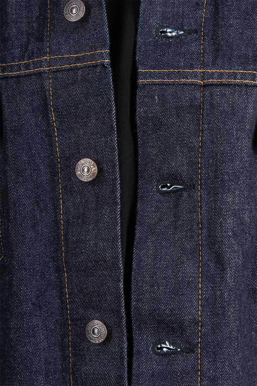 A renewed version of Sugar Cane ’s early 60s denim jacket, known as the 3rd type. The pattern was carefully adjusted for the length to be about 1” longer than the previous model, SC11962, and for a better fit around the neck and shoulders. The red selvage can be seen on the reverse side of the front placket.