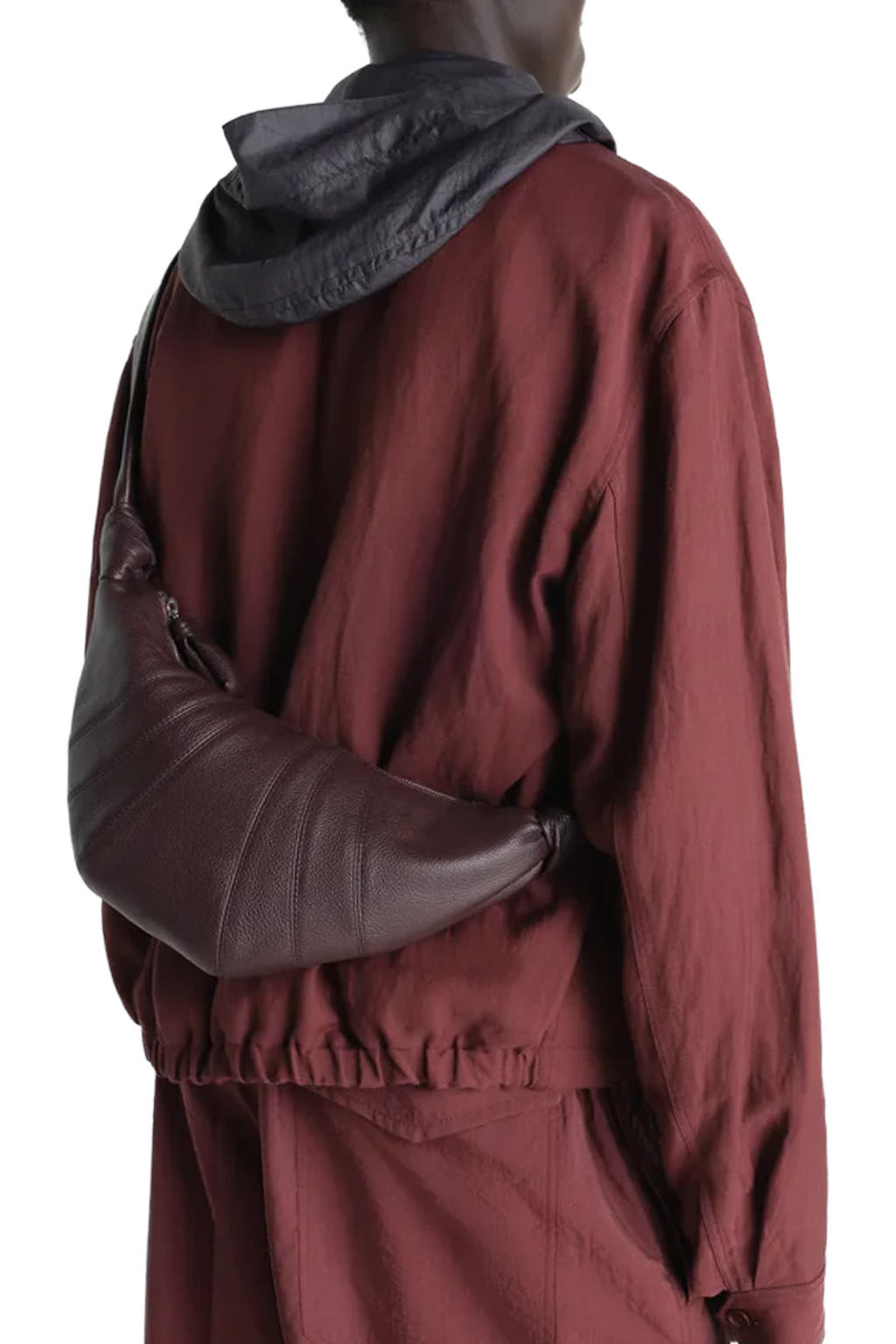 The Croissant line is emblematic of the Lemaire wardrobe. This versatile, supple bag features a curve inspired by the Viennoiserie of the same name, created by an assembly of topstitched panels and knotted elements. This small bag is crafted in grained leather, a supple yet resistant material characterized by its textured look.