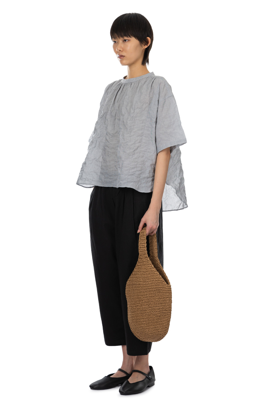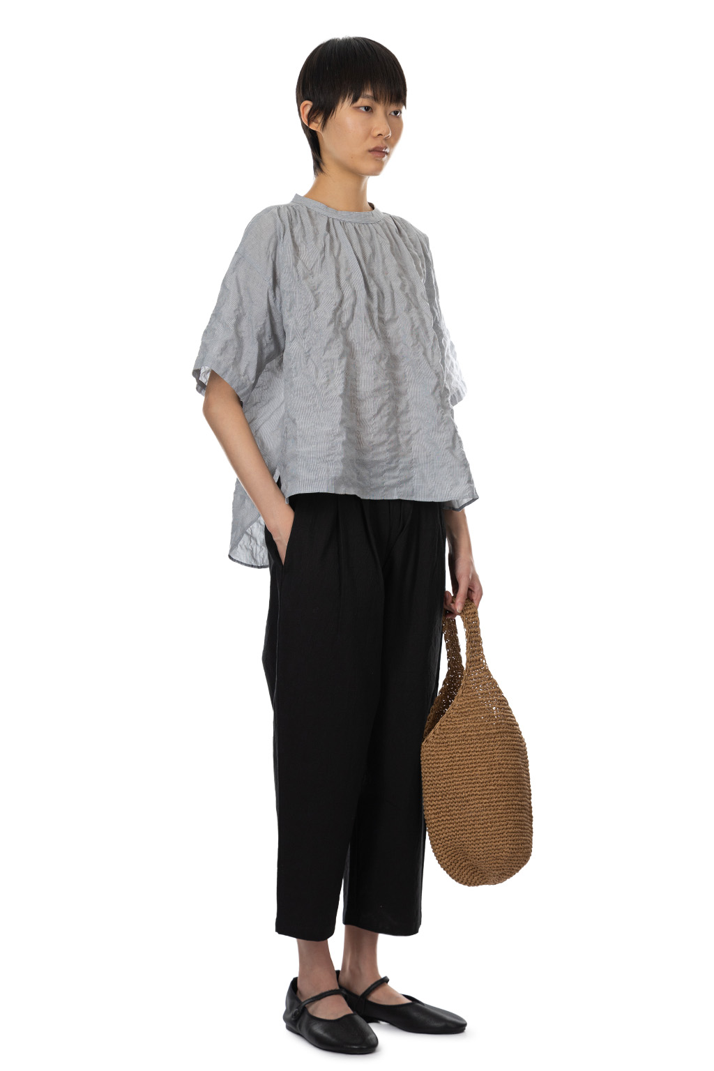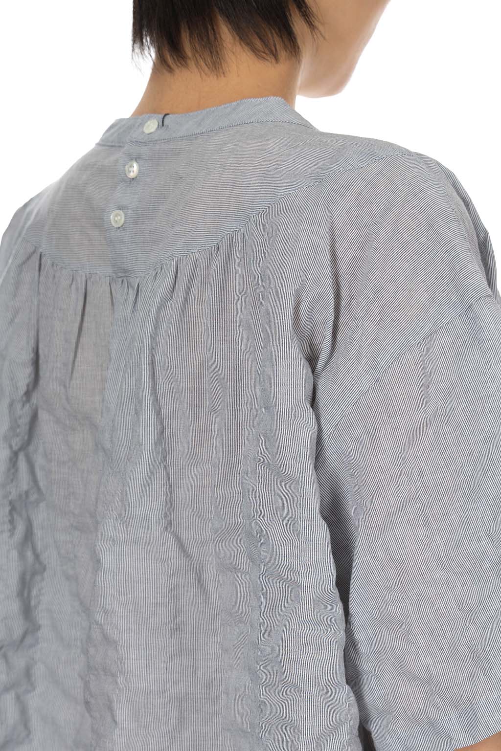 Cotton Shirring Gather Blouse - Black Stripe