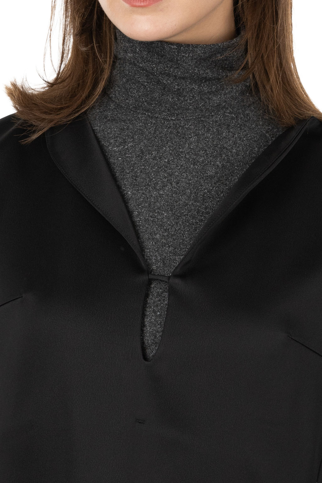 • Features a deep slit that flows from the curved bust to the deep, flowing vertical lines